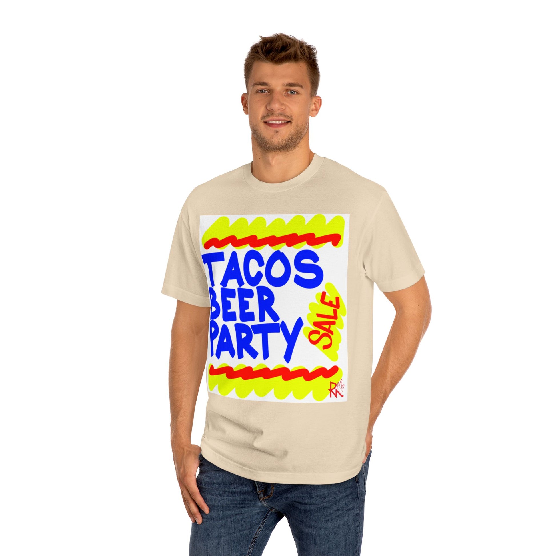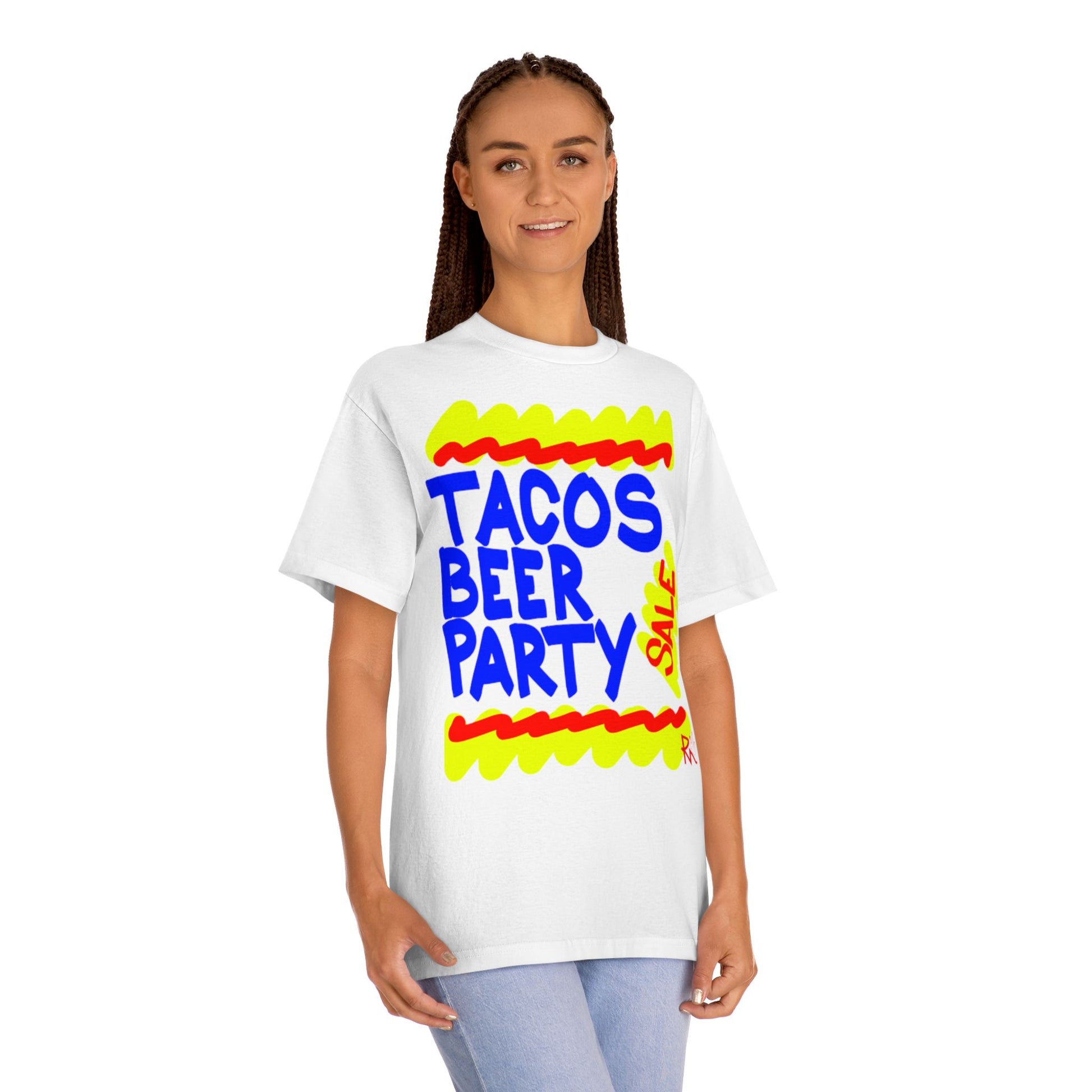 Dive into the weekend spirit with our "Weekend Sale Tee," inspired by the vibrant energy of Chicago's local scenes. This shirt features bold lettering that brings to life the simplicity and appeal of a traditional grocery store sign, spotlighting an unbeatable weekend sale on "Tacos, Beer, Party." Perfect for those who cherish the essence of weekend shenanigans, this tee is a nod to festive times, good eats, and the communal joy found in the city's diverse neighborhoods. It's your wardrobe's invitation to celebrate life's simple pleasures.