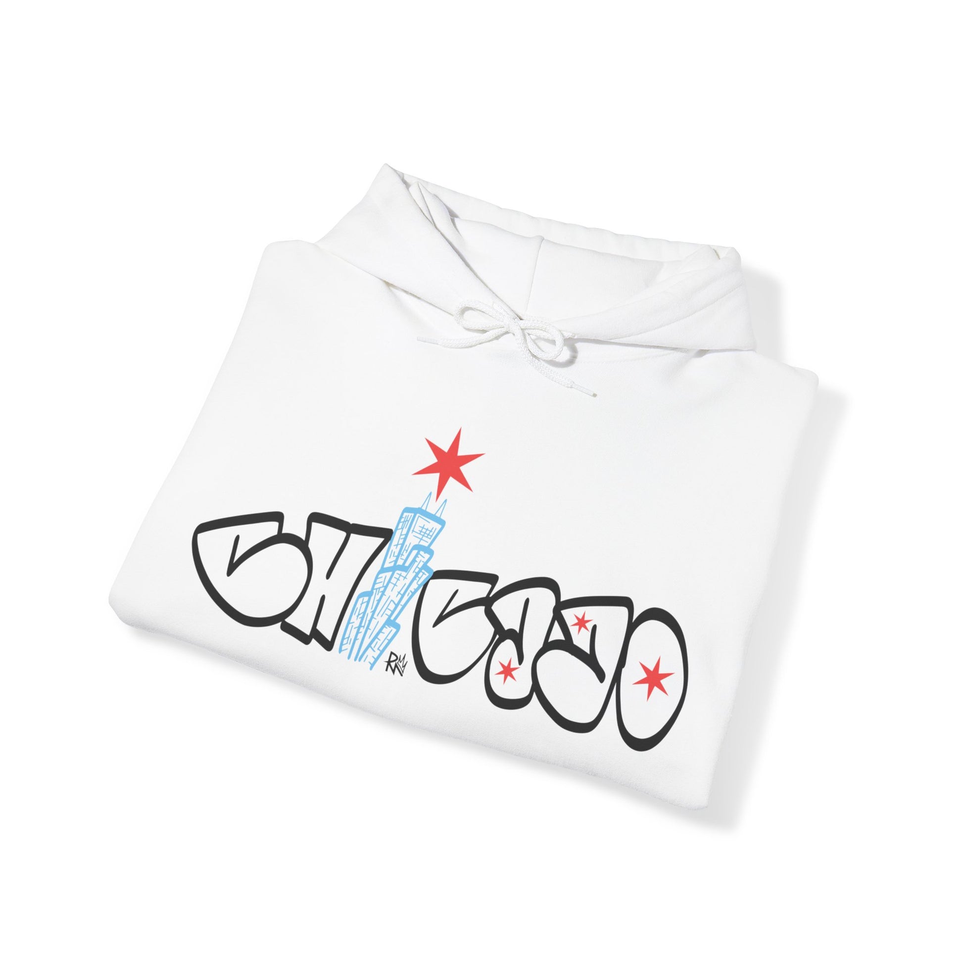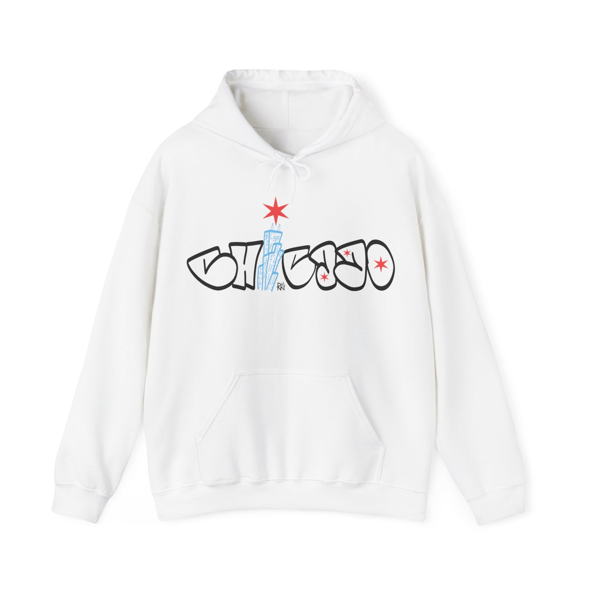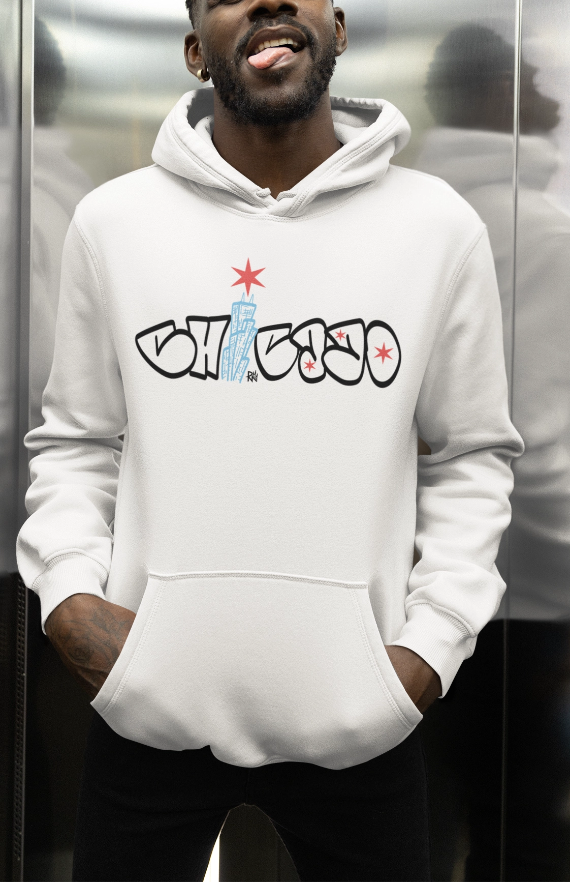 Elevate your streetwear game with our white hoodie featuring 'Chicago' in striking black graffiti font and a graffiti-style line drawing of the iconic Willis Tower. Express your Windy City pride with this stylish and comfortable Chicago hoodie. Shop now for urban-inspired fashion!